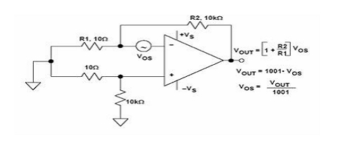 對(duì)于失調(diào)電壓,一般是設(shè)置一個(gè)很大的增益并且把輸入短接。這時(shí)候的輸出電壓除以增益就是失調(diào)電壓的大小。