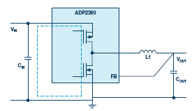 圖2.帶有線圈安放位置的ADP2360降壓轉(zhuǎn)換器的示例電路。