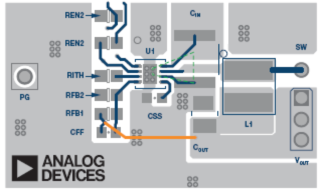 圖2所示為ADP2360的示例布局。在本圖中,圖1中的重要熱回路標(biāo)為綠色。從圖中可見,黃色反饋路徑離線圈L1有一定距離。它位于PCB的內(nèi)層。