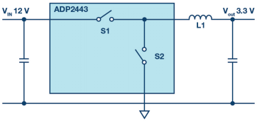 圖2.用于降壓轉(zhuǎn)換的同步開關(guān)穩(wěn)壓器,采用N溝道MOSFET和額外的肖特基二極管,可最大限度地減少干擾。