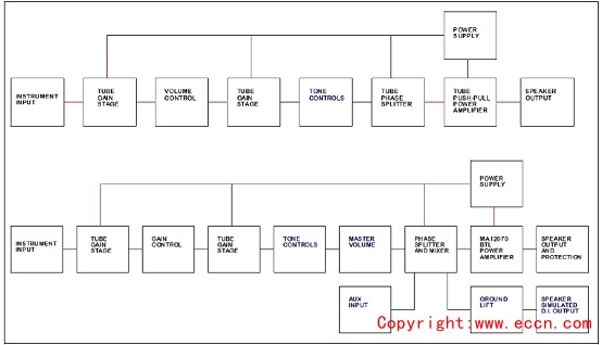 圖3.經(jīng)典美國電子管貝斯放大器(上)和MA12070貝斯放大器(下)拓?fù)鋱D