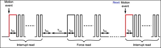 除上述特點以外,M8601還具備獨特的防誤報功能。當(dāng)M8601配置在人體運動檢測工作模式條件下,一旦芯片檢測到人體移動信號并且通過INT/DOCI接口發(fā)出Motion中斷,外部單片機識別到中斷信號之后無需重新配置,可以通過INT/DOCI接口立刻進(jìn)行數(shù)據(jù)采集得到原始PIR信號。然后,單片機再按照預(yù)先設(shè)定的算法,對INT/DOCI接口采集到的PIR原始數(shù)據(jù)以及之前收到的Motion中斷信號進(jìn)行邏輯運算,可以進(jìn)一步判斷是否為真實的人體運動信號還是誤報。芯片的這一功能在很多需要防誤報的應(yīng)用場景中非常重要,如監(jiān)控攝像機、高端遠(yuǎn)程監(jiān)控報警器、紅外攝像機等等。詳細(xì)工作的時序圖如下圖2。