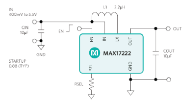 Maxim現(xiàn)在提供DC-DC升壓轉(zhuǎn)換器,擁有超低靜態(tài)電流(300nA)和真關(guān)斷(True Shutdown™)技術(shù),可理想用于要求長(zhǎng)電池壽命的電池供電應(yīng)用。MAX17222 nanoPower升壓調(diào)節(jié)器具有0.5A峰值電感電流限值(圖4)。器件采用真關(guān)斷技術(shù),輸出與輸入斷開(kāi)時(shí),無(wú)正向或反向電流。輸出電壓可由一個(gè)1%標(biāo)準(zhǔn)電阻選擇。MAX17222擁有啟動(dòng)后使能瞬態(tài)保護(hù)(ETP),根據(jù)負(fù)載電流的不同,當(dāng)輸入電壓下降到400mV以下時(shí),允許輸出保持在范圍之內(nèi)。升壓轉(zhuǎn)換器采用8 x 1.4mm2、6焊球WLP封裝和6引腳uDFN封裝,峰值效率高達(dá)95%,最大程度減少散熱。