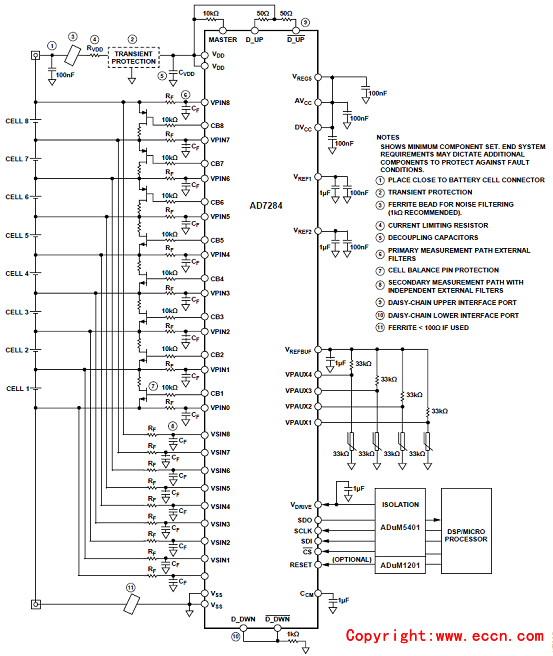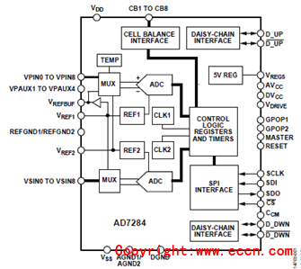 ADI公司的AD7284是完整的14位分辨率鋰電池監(jiān)控系統(tǒng),包含了堆棧鋰電池如用在混合動(dòng)力汽車和備用電池通用監(jiān)控所需要的全部功能.AD7284具有復(fù)接電池電壓和輔助的ADC測(cè)量通路,支持4到8個(gè)電池的測(cè)量.器件提供最大可調(diào)整誤差(TUE) ±3 mV,包括從輸入到輸出的所有內(nèi)部誤差.主要的ADC分辨率是14位,AD7284還包括綜合二次測(cè)量路徑,以驗(yàn)證主ADC上的數(shù)據(jù).其它的診斷特性包括檢測(cè)開路輸入,通信和電源相關(guān)的故障.±16 mV 標(biāo)準(zhǔn)電池堆棧電壓 (TUE) 精度,內(nèi)部溫度傳感器,VDD工作范圍為10 V至40 V,結(jié)溫范圍為−30C至+120C,符合汽車應(yīng)用要求.主要用在鋰電池監(jiān)控,電動(dòng)和混合動(dòng)力汽車,固定動(dòng)力應(yīng)用.本文介紹了AD7284主要特性,功能框圖和菊花鏈連接案例圖,八電池組的主配置圖,三個(gè)器件的菊花鏈配置圖以及評(píng)估板EV-AD7284SSSDZ主要特性,功能框圖,電路圖和材料清單.
