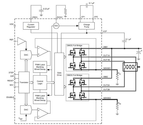 而轉(zhuǎn)換器的特性則大大簡(jiǎn)化了電機(jī)控制系統(tǒng)的設(shè)計(jì)。只需在STEP輸入引腳上施加一個(gè)脈沖,電機(jī)即被驅(qū)動(dòng)一步,無(wú)需相序表或高頻控制線。因此,在主機(jī)微控制器不可用或負(fù)載過重的應(yīng)用中,A3982是最佳選擇。