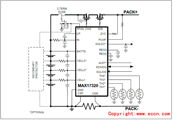 圖4.MAX17320帶保險(xiǎn)絲的應(yīng)用電路圖