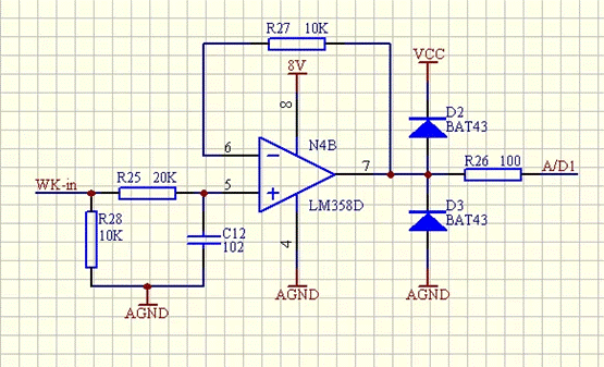 R25 的作用是消反射的,運放的 5、6 角理論上是電壓相同的,且輸入阻抗是無窮大!那么輸入信號的電流主要是通過 R28 流入地,也就是輸入點的電壓在 WK-in 點形成,理論上不會有電流流入 R25。如果沒有 R25,那么信號就會 100%反射到 WK-in 上。如果信號源的內阻非常的大,也就是帶載的能力很差,反射的信號就會在 R28 的輸入點附近形成很強的發(fā)射震蕩,也就是“回音”這樣的噪聲,經過放大就會使輸出信號質量很差,R25 和 C12 的接入可以把在 5pin 的反射信號有效地吸收,高頻的反射信號通過 C12 泄放到地(AGND)R25 把反射的信號阻隔在 5pin 的輸入端。