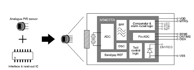 M9401專門為智能式單芯片熱釋電傳感器量身打造,減少了外部單片機(jī)及運算放大電路。它具有極小的芯片面積、特殊的輸入、輸出電路結(jié)構(gòu)和片內(nèi)信號處理能力,可以集成在PIR探頭內(nèi)部與陶瓷敏感元直接連接,檢測到人體感應(yīng)并輸出觸發(fā)事件。我們稱之為智能PIR傳感器(右下圖),它取代了傳統(tǒng)模擬探頭加外部芯片的分立方案(左下圖)。該智能方案具有高靈敏度、功耗極低、外圍電路配置簡單靈活、高可靠性、抗RF干擾能出眾等優(yōu)點;谏鲜鲞@些優(yōu)點,該方案在盡可能減少外部元器件數(shù)量的同時又能適用于非常寬廣的應(yīng)用領(lǐng)域。