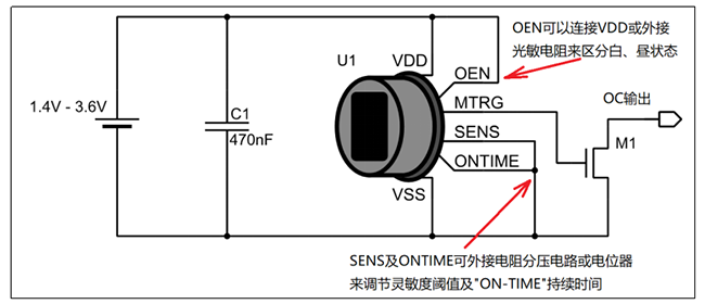 上圖是內(nèi)置M9401芯片的智能型熱釋電傳感器的最小工作系統(tǒng),在熱釋電數(shù)字探頭內(nèi)部集成了全新的智能型PIR信號調(diào)理芯片M9401。傳感器的靈敏度以及ONTIME的值可以在這兩個引腳上設(shè)計電阻分壓器或者是電位器,通過調(diào)節(jié)這些硬件電路來調(diào)整傳感器的不同工作狀態(tài)。另外,OEN引腳可以外接光敏電阻來控制傳感器在白天、晝夜的環(huán)境中交替工作。相比之前的智能數(shù)字探頭,采用M9401芯片的探頭功耗大大降低,同時,其所具備的自檢功能可滿足探頭廠家的半成品自動檢測,節(jié)約了后續(xù)的檢測工序成本。 |
