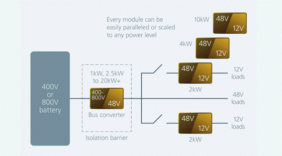 •混合動(dòng)力車:根據(jù)不同分布式負(fù)載的電源分析,可以設(shè)計(jì)一個(gè)模塊并對(duì)其進(jìn)行適當(dāng)功率粒度及擴(kuò)展性認(rèn)證,用于并行陣列擴(kuò)展。通過(guò)使用分布式模塊代替大型集中式 DC-DC 轉(zhuǎn)換器,能夠以顯著降低的成本實(shí)現(xiàn) N+1 冗余。如果在汽車開(kāi)發(fā)階段負(fù)載功率有變,該方法依然有優(yōu)勢(shì)。工程師可以增減模塊,無(wú)需對(duì)整個(gè)已完成定制電源進(jìn)行修改。另一個(gè)設(shè)計(jì)優(yōu)勢(shì)是縮短開(kāi)發(fā)時(shí)間,因?yàn)槟K已獲得了相應(yīng)認(rèn)證。