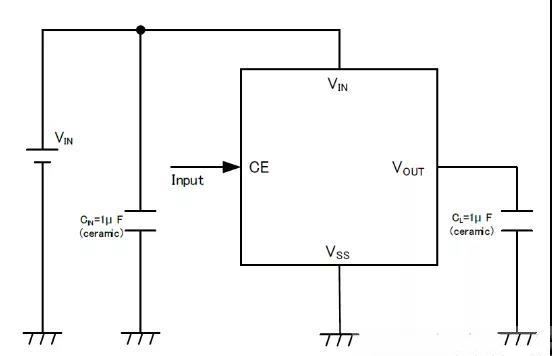 從CE端子輸入低電平能使IC成待機狀態(tài)。此外,在待機狀態(tài)時,能用VOUT端子-VSS端子之間的內(nèi)部開關使穩(wěn)定輸出用電容(CL)的充電電荷放電。此功能可以使VOUT端子迅速地返回VSS電平。