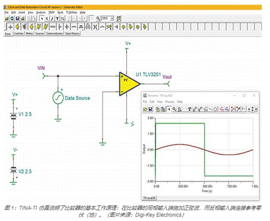 所用比較器采用 Texas Instruments 的 TLV3201AQDCKRQ1 單比較器,該器件具有推挽輸出。像所有比較器一樣,該器件有兩個輸入。帶負(fù)號 (-) 的反相輸入和帶正號 (+) 的同相輸入。比較器輸入非常類似于運算放大器輸入。主要區(qū)別在于比較器輸出是數(shù)字邏輯狀態(tài)而非模擬電壓。在圖 1 中,輸入是幅值為 200 毫伏 (mV) 的 1 兆赫茲 (MHz) 正弦波。當(dāng)同相輸入端的電壓大于反相輸入端的電壓時,輸出將處于高電平狀態(tài),此時為 2.5 伏。當(dāng)同相輸入端的電壓低于反相輸入端的電壓時,輸出將變?yōu)榈碗娖綘顟B(tài),此時為 -2.5 伏。該比較器具有軌至軌輸出,因此輸出邏輯狀態(tài)可擴(kuò)展到電源電平。本例中,使用對稱的 2.5 伏正負(fù)電源并且反映在輸出電壓擺幅中。