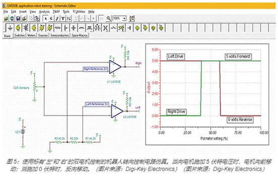 窗口可用于機(jī)器人技術(shù),通過光線和兩個 CDS 光電管來控制機(jī)器人的移動方向。例如,硫化鎘 (CDS) 光電池在燈光下會改變電阻,黑暗環(huán)境下電阻較高而燈光下則電阻較小。TINA-TI 仿真使用 Texas Instruments LM393BIPWR 雙比較器說明了這一原理(圖 5)。