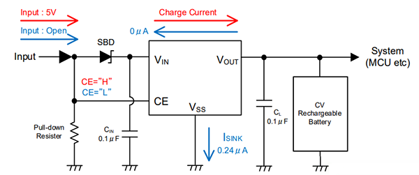 充電用調(diào)整器IC可對應(yīng)2.3V鋰二次電池的充電電壓的電壓要求,即使考慮到偏差,也可以輸出不超過二次電池的上限充電電壓。還可將從不充電時的二次電池流到充電IC的吸收電流(sink current)抑制得很小,大大有助于延長電池驅(qū)動時間。