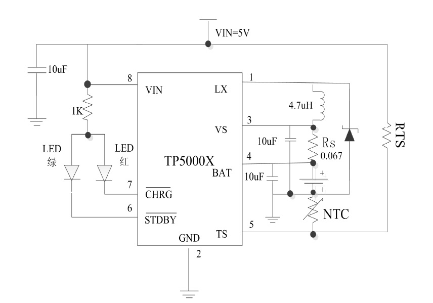 TP5000X具有寬輸入電壓,對(duì)電池充電分為涓流預(yù)充、恒流、恒壓三個(gè)階段,涓流預(yù)充電電流(QFN16)、恒流充電電流都通過(guò)外部電阻調(diào)整,最大充電電流達(dá)2A。TP5000X采用頻率800kHz的開(kāi)關(guān)工作模式使它可以使用較小的外圍器件,并在大電流充電中仍保持較小的發(fā)熱量。TP5000X內(nèi)置功率PMOSFET、防倒灌電路,所以無(wú)需防倒灌肖特基二極管等外圍保護(hù)。TP5000X的恒流功能(QFN16),也可以用在2串鋰電池或4串干電池輸入,恒流驅(qū)動(dòng)0.5-7W白光LED。