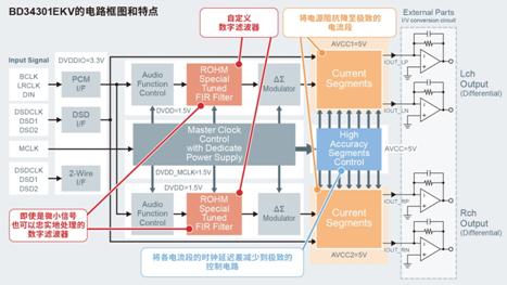 “BD34301EKV”作為ROHM推出的音頻IC的高端系列“MUS-IC™”中的DAC芯片,在開發(fā)之初就很注重“空間音效”、“規(guī)模感”及“靜謐性”等欣賞古典音樂時的重要音質(zhì)性能。憑借ROHM自有的音質(zhì)設(shè)計技術(shù),在決定音質(zhì)的關(guān)鍵—信號處理電路設(shè)計過程中,采用邊確認音質(zhì)邊設(shè)計電路的方式,成功地實現(xiàn)了目標音質(zhì)。同時,低噪聲(SN比)和低失真率(THD+N特性)作為音頻產(chǎn)品的重要特性,也達到了業(yè)界極高水平(SN比130dB,THD+N-115dB),其性能非常適合高音質(zhì)音響設(shè)備。此外,作為數(shù)字信號處理電路主要功能的內(nèi)置數(shù)字濾波器采用可自定義的規(guī)格,有助于實現(xiàn)音響設(shè)備制造商所追求的理想音質(zhì)效果。
