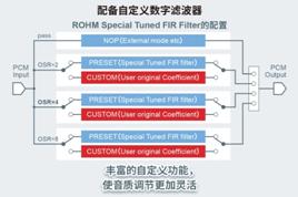 “BD34301EKV”可以從“預(yù)設(shè)/自定義/外設(shè)”中選擇會影響音質(zhì)的數(shù)字信號處理電路的數(shù)字濾波器(FIR濾波器)。濾波器的計算系數(shù)和過采樣率也可以通過編程功能進行自定義。利用這些特色,客戶可以構(gòu)建自己的數(shù)字濾波器,并輕松地為不同的音響設(shè)備實現(xiàn)不同的音質(zhì)調(diào)整,這將非常有助于減少客戶開發(fā)工時并實現(xiàn)制造商所追求的理想音質(zhì)效果。