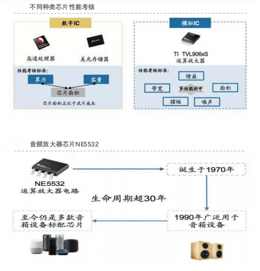 3.生命期:模擬IC產(chǎn)品生命周期一般不低于10年,一旦切入產(chǎn)品便可以獲得穩(wěn)定的芯片出貨量。先進制程對于模擬類產(chǎn)品推動作用較小,基本不受摩爾定律推動,因此模擬類產(chǎn)品性能更新迭代較慢。著名的音頻放大器芯片NE5532生命周期長達30年,至今依然是多款音響設(shè)備的標(biāo)配芯片。