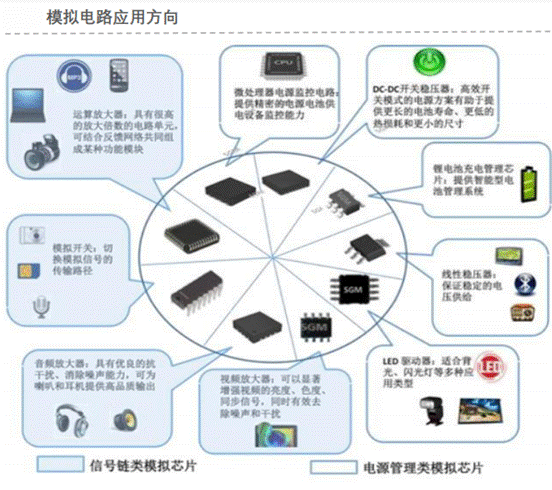 1.模擬芯片:放大器、數(shù)據(jù)轉(zhuǎn)換、比較器、電源管理、數(shù)據(jù)轉(zhuǎn)換芯片等產(chǎn)品進行應(yīng)用。模擬類產(chǎn)品不同,產(chǎn)品功能多樣且考核指標(biāo)繁多,沒有嚴格意義上性能優(yōu)越的模擬芯片。