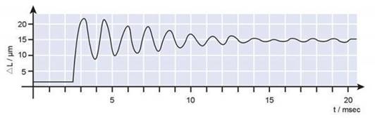 當(dāng)給陶瓷施加一個(gè)短的電脈沖,陶瓷在其階躍時(shí)間tmin內(nèi)伸長(zhǎng)。同時(shí)共振頻率將被激發(fā),陶瓷在其伸長(zhǎng)位置的附近做阻尼振蕩。更短的電脈沖只能使振幅更高,但不能縮短階躍時(shí)間。下圖顯示了一個(gè)壓電陶瓷在短脈沖電信號(hào)激勵(lì)下,陶瓷的上升時(shí)間為600us,諧振頻率為560Hz。