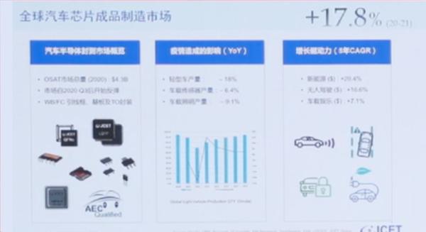 挑戰(zhàn)的另一面,全球汽車芯片成品制造亦面臨著機(jī)遇。隨著車載芯片功能日益復(fù)雜化,傳統(tǒng)車企逐漸拋棄全流程自主生產(chǎn)的 IDM 模式,而是將芯片設(shè)計(jì)、制造、封測(cè)環(huán)節(jié)委托給更專業(yè)的芯片玩家。據(jù)鄭力分享,2021 年全球汽車芯片成品制造有望同比增長(zhǎng) 17.8%,車載芯片制造供應(yīng)鏈正開啟重組模式,有望引發(fā)全新機(jī)遇。