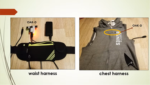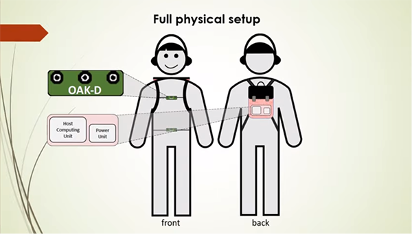 這個(gè)系統(tǒng)位于一個(gè)小巧的背包內(nèi),其中包含一個(gè)主機(jī)計(jì)算裝置,就像一個(gè)筆記本電腦。攝像頭隱藏在馬甲外套中,一個(gè)口袋大小的電池包放在腰包中,能夠提供使用大約8個(gè)小時(shí)的電力。一個(gè)Luxonis OAK-D空間人工智能攝像頭可以黏貼在馬甲或腰包上,然后連接到背包中的計(jì)算裝置。馬甲上有三個(gè)放置OAK-D攝像頭的小孔,而攝像頭則位于馬甲內(nèi)側(cè)。