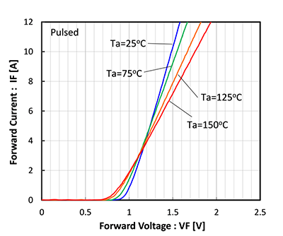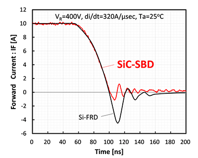 正向電壓VF(@ IF = 10A)低至1.5V,并且對開關時功率損耗產(chǎn)生影響的恢復時間僅為10ns(@ VR = 400V),具有高性能二極管特性。這與硅快速恢復二極管相比,可以實現(xiàn)更快,更高效的工作。