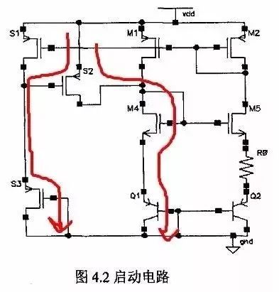 啟動(dòng)模塊的作用自然是來(lái)啟動(dòng)芯片工作的,因?yàn)樯想娝查g有可能所有晶體管電流為0并維持不變,這樣沒(méi)法工作。啟動(dòng)電路的作用就是相當(dāng)于“點(diǎn)個(gè)火”,然后再關(guān)閉。如圖:
