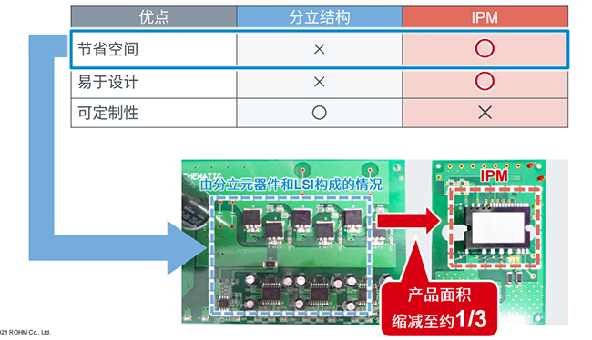 IPM即智能功率模塊,與普通功率模塊相比,IPM可以將功率器件集成在一個(gè)封裝器件中,同時(shí)還可以把相應(yīng)的驅(qū)動(dòng)電路以及周邊的保護(hù)電路全部集成到模塊里,幫助工程師簡(jiǎn)化產(chǎn)品設(shè)計(jì)。以空調(diào)電機(jī)的壓縮機(jī)控制板為例,從圖中可以看出,左側(cè)藍(lán)色邊框內(nèi)的部分是以往的功率驅(qū)動(dòng)板,將功率器件、驅(qū)動(dòng)電路和電流檢測(cè)保護(hù)電路分布在板子上,完成一個(gè)功率轉(zhuǎn)換的電路。相比右側(cè)而言,IPM完全取代這些器件,既易于設(shè)計(jì),又可以將產(chǎn)品面積縮減至三分之一。盡管在一些性能指標(biāo)的對(duì)應(yīng)上面,分離器件可以更靈活的對(duì)外圍器件做調(diào)整,但隨著IPM現(xiàn)在性能越來越可靠,應(yīng)用越來越適用,調(diào)整電路的要求逐步弱化。
