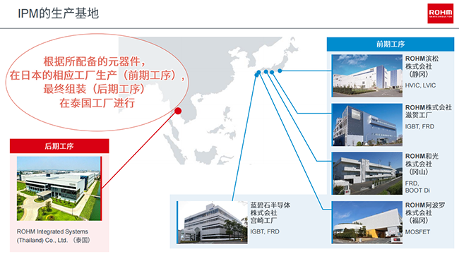 IPM作為一個(gè)功率模塊,里面包含很多的功率器件,ROHM所有的功率器件,包括前端,從晶圓到裸片的開發(fā),都是在日本的工廠完成。完成后,會(huì)送到泰國(guó)工廠做后續(xù)的封裝以及測(cè)試的工作。完成封裝、測(cè)試以后,然后再做全球的出貨、統(tǒng)配工作,可以說所有產(chǎn)品保障都是由ROHM公司內(nèi)部完成。