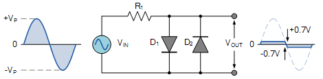 如下圖所示,當(dāng)在正半周期,并且VIN大于等于0.7V,二極管正向?qū)。此時,VOUT會被鉗位在0.7V上。