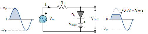 當(dāng)所加的偏壓與二極管導(dǎo)通方向一致,鉗位值會提高V1,Vout=2V+V1。