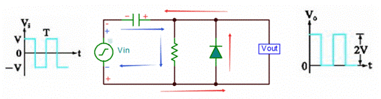下面是二極管結(jié)合電容實(shí)現(xiàn)的鉗位電路。分析中不考慮二極管的導(dǎo)通壓降,假設(shè)RC時間常數(shù)足夠大,從而使輸出波形不會失真。