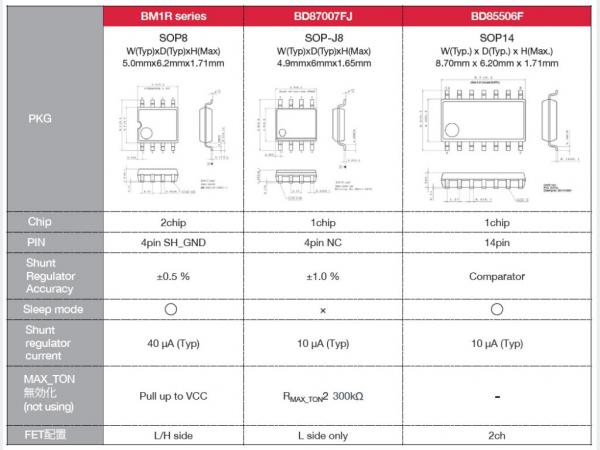 為了盡可能有效地滿足市場(chǎng)需求,ROHM開發(fā)了單通道和雙通道同步MOSFET控制器(圖2)。BD1R001xxF內(nèi)置有兩枚芯片。BD87007FJ(一個(gè)通道)和BD85006F(兩個(gè)通道)內(nèi)置有一枚芯片,可以實(shí)現(xiàn)兩種功能:SR控制器和并聯(lián)穩(wěn)壓器。這些器件的封裝類型和規(guī)格概覽參見圖3。下文將介紹這些控制器的部分功能。