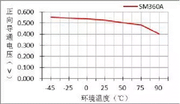 在我們開發(fā)產(chǎn)品的過程中,高低溫環(huán)境對電子元器件的影響才是產(chǎn)品穩(wěn)定工作的最大障礙。環(huán)境溫度對絕大部分電子元器件的影響無疑是巨大的,二極管當(dāng)然也不例外,在高低溫環(huán)境下通過對SM360A的實測數(shù)據(jù)表1與圖3的關(guān)系曲線可知道:二極管的導(dǎo)通壓降與環(huán)境溫度成反比。在環(huán)境溫度為-45℃時雖導(dǎo)通壓降最大,卻不影響二極管的穩(wěn)定性,但在環(huán)境溫度為75℃時,外殼溫度卻已超過了數(shù)據(jù)手冊給出的125℃,則該二極管在75℃時就必須降額使用。這也是為什么開關(guān)電源在某一個高溫點需要降額使用的因素之一。