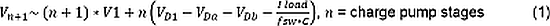 在公式(1)中,可以看出Vn+1很大程度上由n的倍數(shù)決定,但受到二級(jí)管正向壓降相關(guān)的“誤差項(xiàng)”和電荷泵轉(zhuǎn)換電容紋波電壓的影響,會(huì)有所減少。假設(shè)所有二極管都是相同類型的,那么它們的正向電壓等于: