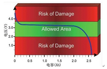 電池一旦電壓超出允許范圍,鋰電池很容易被損壞(見圖1.1.3)。如果超出電壓的上限和下限(例如,nanophosphate鋰電池的電壓上限和下限分別為3.6V和2V),電池就可能會受到不可逆的損壞,至少也會增加電池的自放電率。在相當(dāng)寬的荷電狀態(tài)范圍內(nèi),輸出電壓可以保持穩(wěn)定,因此正常情況下超出安全范圍的可能性比較小。但是,在接近安全范圍上限和下限的區(qū)域,變化曲線非常陡峭。作為預(yù)防措施,仔細(xì)監(jiān)測電壓水平非常必要。