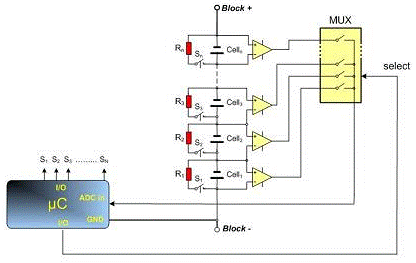 為了對每個電池的荷電狀態(tài)進(jìn)行管理,每個電池的電壓都要加以測量。由于只有1號電池處于微控制器模數(shù)轉(zhuǎn)換范圍內(nèi),因此不能直接測量電池塊中其他電池的電壓。一種可能的方案是采用差分放大器陣列,但這需要保持整個電池塊的電壓水平。