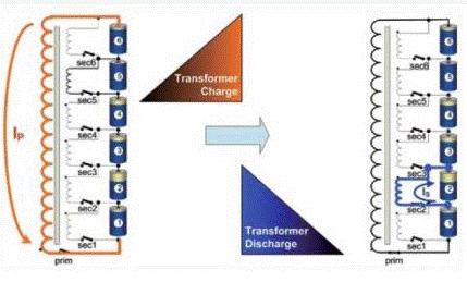 如果某個電池單元的電壓高于其他單元,那么就需要將其中的能量導(dǎo)出,這在充電模式下尤其必要。如果不進(jìn)行均衡,充電過程在第一塊電池單元充滿之后就不得不立即停止。均衡可以保持所有電池單元的電壓相等而避免發(fā)生過早停止充電的情況。圖2.1給出了頂部平衡模式下的能量流動情況。在電壓掃描之后,發(fā)現(xiàn)電池單元5 是整個電池組中電壓最高的單元。此時閉合開關(guān)sec5,電流從電池流向變壓器。在開關(guān)sec5 斷開后閉合主開關(guān),此時,變壓器就從儲能模式進(jìn)入了能量輸出模式。能量通過初級線圈送入整個電池組。