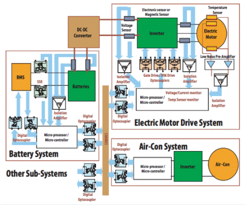 石油價格的迅速上漲推動了高能效混合動力汽車(HEV)的增長成為汽車行業(yè)的中心;旌蟿恿ζ囍惺褂玫母邏弘姵匦枰^緣和隔離。在當(dāng)前的混合動力設(shè)計中,已經(jīng)選擇了光耦合器來完成這項任務(wù)。圖1顯示了在HEV的電動機驅(qū)動系統(tǒng)中放置光耦合器的示例。