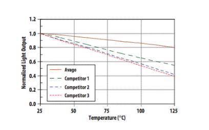 LED的亮度與溫度成負系數(shù)。為了能夠處理超過+105°C(汽車1級和2級)的環(huán)境溫度,低溫漂移在 地減少參數(shù)溫度漂移方面具有顯著優(yōu)勢。用于Avago汽車級光電耦合器的LED在+125°C時通常下降<20%,而商用(消費級和通用工業(yè))紅外LED通常在+125°C時下降高達60%(圖3) )。由于這超出了商用LED的建議溫度范圍,因此確實突出了重要的一點,即只有特殊設(shè)計的用于高溫工作的LED才能用于汽車級光耦合器。