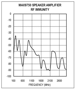 注:圖 2 給出了 MAX9750 IC 的典型 RF 抑制能力。天線信號(hào)強(qiáng)度、電纜長(zhǎng)度及揚(yáng)聲器類型等一些外部因素也會(huì)影響 RF 抑制性能。