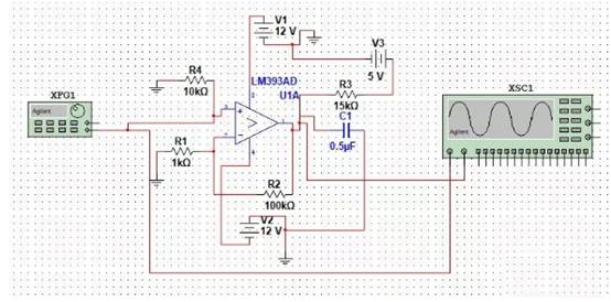 在Multisim軟件中建立圖2所示的仿真環(huán)境,用虛擬的安捷倫信號(hào)發(fā)生器和示波器觀察仿真結(jié)果。