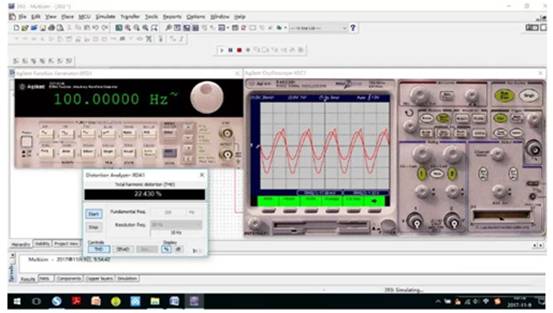 保持輸入信號(hào)幅度不變,頻率繼續(xù)增加到100Hz,此時(shí)輸出波形已經(jīng)嚴(yán)重失真,幅度也減小很多,有向三角波發(fā)展的趨勢(shì),失真度高達(dá)22.430%。