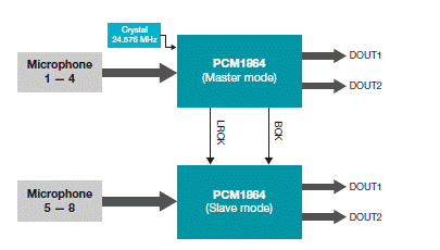 在采用多麥克風(fēng)設(shè)計和語音識別時,我們也無需重新設(shè)計。基于PCM1864 的TI 圓形麥克風(fēng)板(CMB) 參考設(shè)計(如圖 3 所示)使用兩個 4 通道音頻ADC 與一組模擬麥克風(fēng)(  多含八個)連接,并且可以在嘈雜的環(huán)境中提取清晰的用戶語音指令。