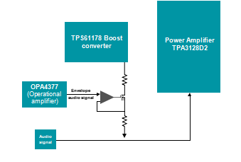 為了提高效率,您也可以根據(jù)內(nèi)容動態(tài)調(diào)整放大器的輸出電源電壓。這種技術(shù)稱為包絡(luò)跟蹤。它僅在音樂 需要提高功率時跟蹤音頻內(nèi)容并提高電壓(輸出功 率),特別是在重低音部分(信號內(nèi)容中有許多峰值)。
