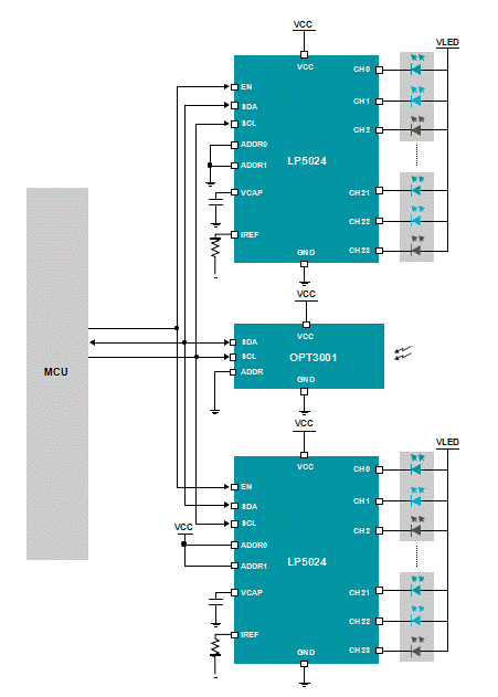 如圖 6 所示,各種LED 環(huán)形燈照明圖案參考設(shè)計說明了如何使用裝有集成式LED 引擎的新型多通道RGB LED 驅(qū)動器設(shè)計多色RGB LED 環(huán)形燈圖形子系統(tǒng)。使用環(huán)境光傳感器 IC 可自動控制LED 亮度。