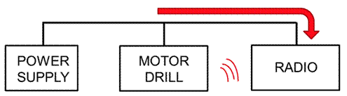 電磁干擾 (EMI) 可能會(huì)以兩種方式顯現(xiàn)。例如連接相同電源供應(yīng)器的無(wú)線電和電機(jī)鉆就是一例,如圖 2 所示。在本例中,敏感無(wú)線電系統(tǒng)的運(yùn)作會(huì)透過傳導(dǎo)方式受到電機(jī)影響,因?yàn)檫@兩者共享相同的電源插座。電機(jī)也會(huì)透過電磁輻射對(duì)無(wú)線電的功能造成影響,因?yàn)榍笆鲭姶泡椛鋾?huì)透過空氣耦合,并受到無(wú)線電天線接收。