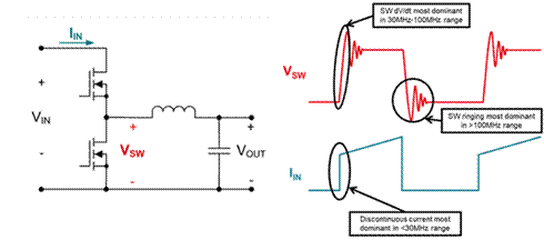 如圖 4 所示,在 SMPS 中進(jìn)行切換的本質(zhì),會(huì)導(dǎo)致產(chǎn)生非連續(xù)輸入電流、在切換節(jié)點(diǎn)的高邊緣速率,以及電源回路中因寄生電感而在切換邊緣產(chǎn)生的其他振鈴。非連續(xù)電流會(huì)影響 <30 MHz 頻帶的 EMI,而在切換節(jié)點(diǎn)的高邊緣速率以及振鈴則會(huì)影響 30 至 100 MHz 頻帶的 EMI,以及 >100 MHz 之頻帶的 EMI。