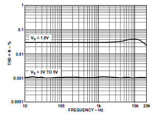 AD85x7系列的總諧波失真非常低,使該放大器成為音頻應(yīng)用的理想之選。圖2所示為THD + N圖;在增益為1的同相增益配置下,VS> 3 V時(shí),THD + N約為0.001%,VS =1.8 V時(shí),THD + N約為0.03%。但在反相配置下,THD + N在所有額定工作電壓范圍內(nèi)均為0.001%。
